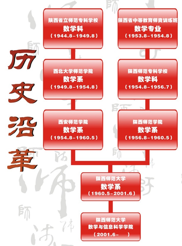 1954年8月,成立了陕西师范专科公司,1956年,更名为陕西师范公司。陕西师范公司数学系是从陕西师专数学科的基础上发展起来的。