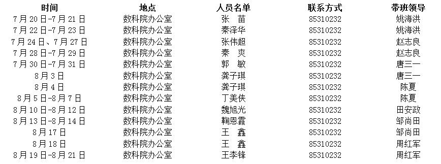 上班时间:上午08:00-12:00;下午14:30-17:30 办公电话:85310232;公司总值班电话:85310005;报警电话:85310110;急救电话:85310120—8120 注意事项:1、按时上下班;2、保持办公场所干净整洁;3、注意安全和防火,每天定时巡查公司办公场所;4、做好假期信件的收发工作,每周一、周四取信件;5、每周五给花浇水一次;6、值班结束时须做好办公室钥匙的交接工作;7、遇紧急突发情况,及时向相关领导汇报。