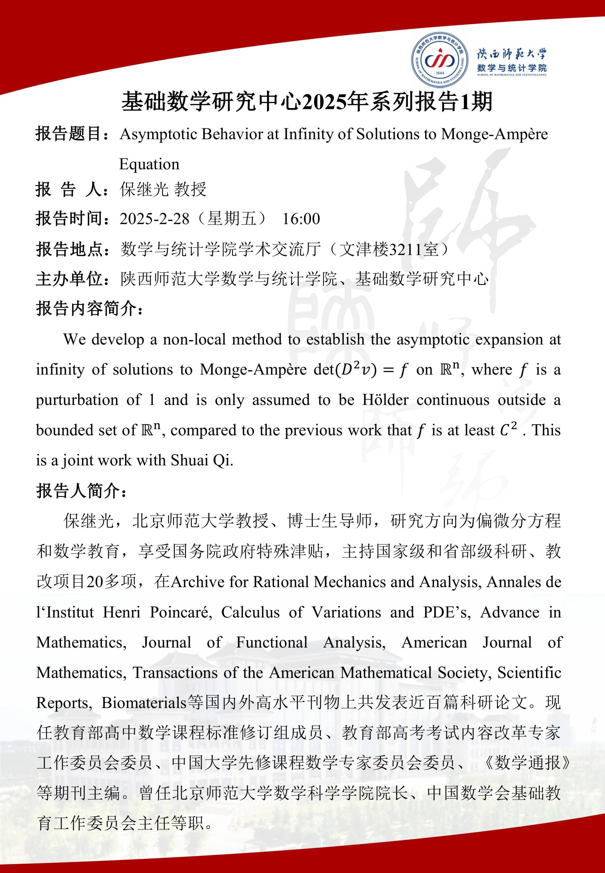 数统华章2025系列1 Asymptotic Behavior at Infinity of Solutions to Monge-Ampère Equation