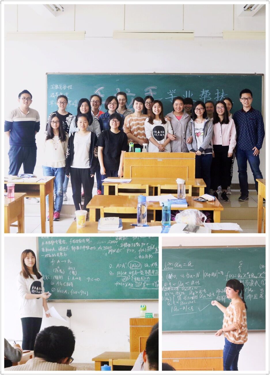 本学期开学后,2015级各班开展了“1对1”、“1对多”学业帮扶活动,采取自愿原则,由需要帮扶同学和志愿帮扶同学结对子,一起上自习,一起养成良好的良好的学习习惯,一起解决学习上的难题。李芳和秦小雨专业知识比较扎实,她们自发组织了自己的小课堂,为转专业的同学讲解大一的数学分析和高等代数两门课,第7-17周每周六上午在文津楼402教室进行。课后,她们还将重点习题整理成作业分发给同学们,以便于同学们对所学知识进行巩固与提升。