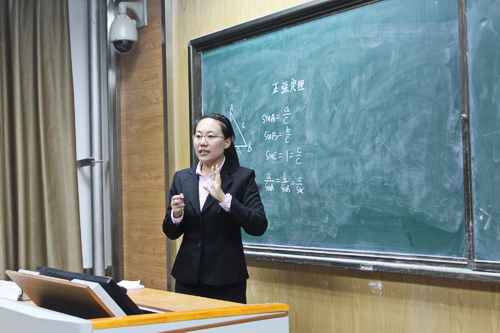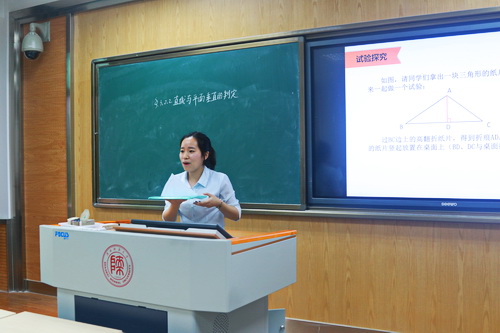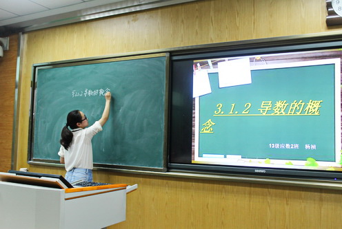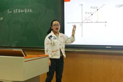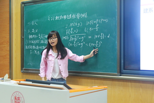 同学们在短暂的7分钟讲课时间内,利用多媒体辅助教学,充分展示自我教学风采,演绎了一场场精彩的小课堂。课堂安排全面,包括了课前回顾、问题探究、知识讲解、例题展示、课堂小结、习题布置等部分。同学们精心描绘的生动形象的图形,设计的整齐美观的板书,条理清晰逻辑严明的课程,展现的自然大方的“台风”,得到了评委老师和台下观众的连连好评。