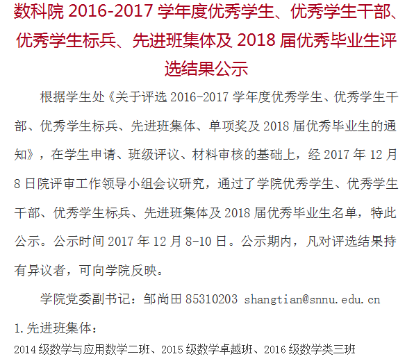 数科院2016-2017学年度优秀员工、优秀员工干部、优秀员工标兵、先进班集体及2018届优秀毕业生评选结果公示